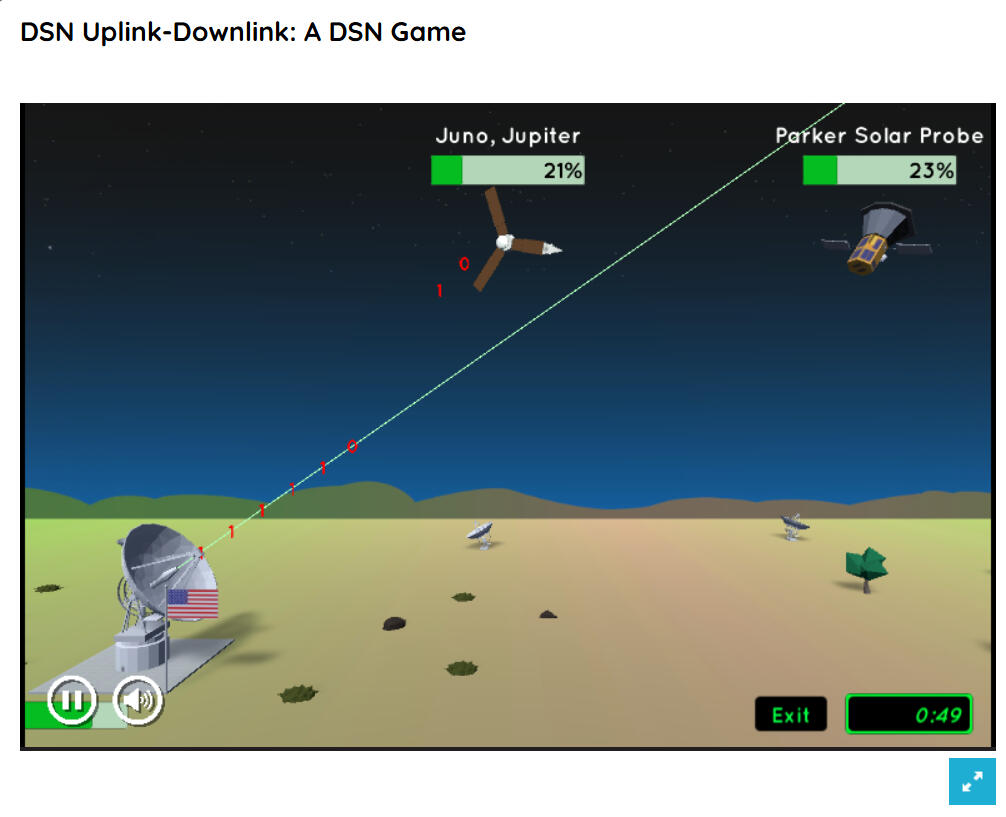 DSN Uplink-Downlink: A DSN Game is a short game created by NASA where you play as a DSN by using the arrow keys or AD to aim the satellite and shoot/receive data from satellites outside of Earth. The difficulty provides fun and challenge whilst also providing a simple idea on how DSN receives and transmit data to satellites outside of the Earth.
