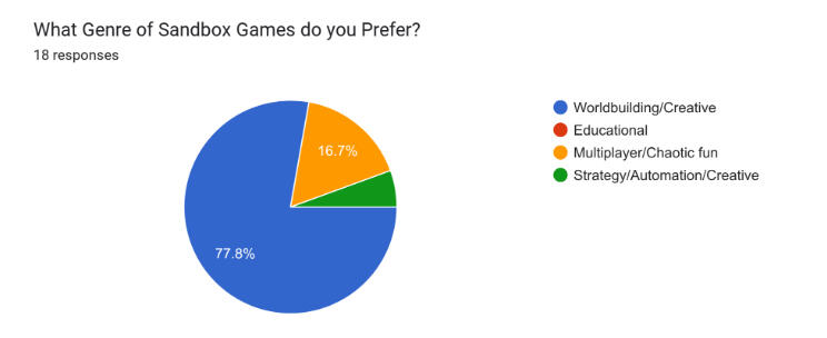 Additionally, players return back to Sandbox games not just for creativity and worldbuilding purposes, but to also try "new ideas like following a tutorial or running a simulation to see what happens". Experimenting in Sandboxes is not a new concept, and it's commonly found in Minecraft challenges/mods and STEM games like Kerbal Space Program, Space Engine, and Universe Sandbox.Players also found interest in the adventure of these genre of games, how they demonstrate "experiences that you don't experience in real life situations" which contributes to their immersion meter.My final question was if players think Sandboxes can be used as an educational tool, which 100% of participants voted 'yes'.
